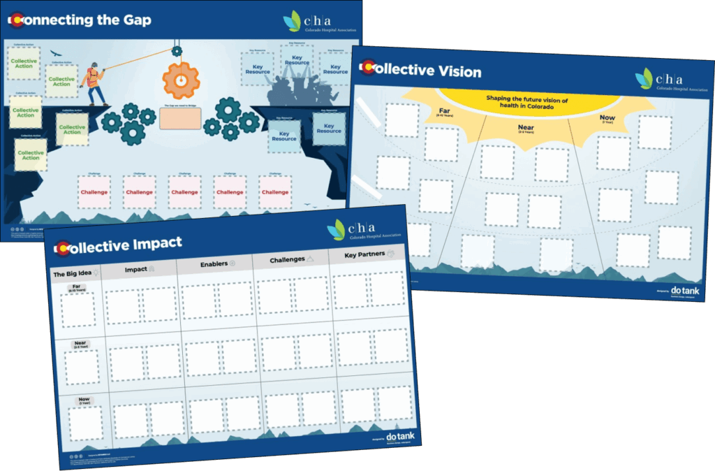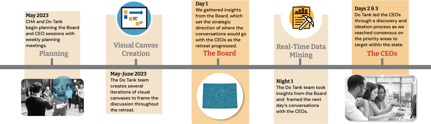 The DoTank team worked closely with the Colorado Hospital Association C-Suite, Board, and CEOs to reshape their vision of healthcare in Colorado. Our team facilitated sessions with the Board and CEOs over the course of four days at their retreat. The planning and preparation started weeks in advance.