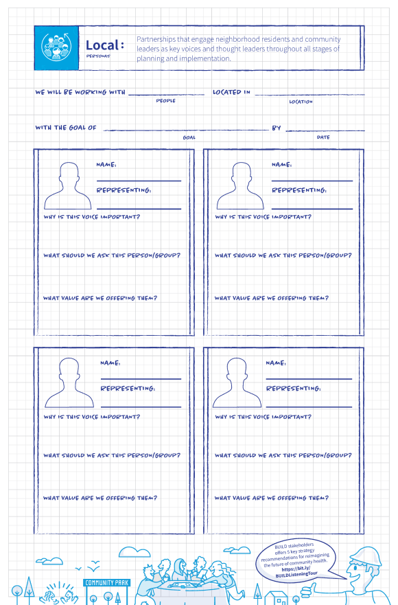 We created two activities for each BUILD principle–one to introduce the principle and one to dig deeper. These tools were designed in a way that all 10 could be completed sequentially as a new coalition forms and works to set goals and boundaries, or completed individually based on the needs of the team. We are proud of these original bespoke tools and the application they will have in community health, and are fortunate to have partnered with BUILD Health to provide thought leadership around activating community-based partnerships through engaging activities!