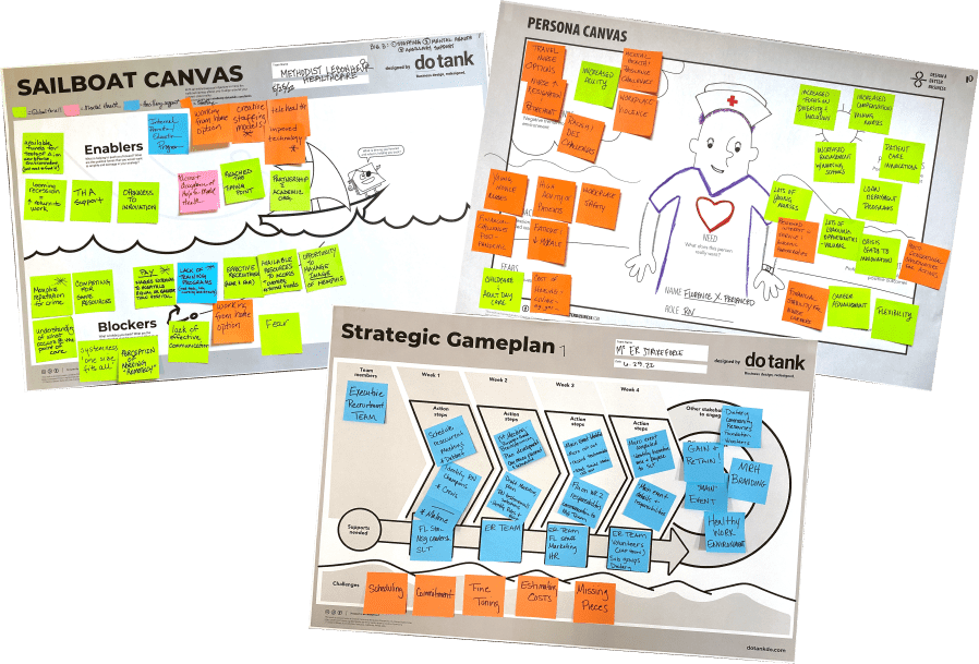 We used visual canvases to power the work. Through canvas-based activities, we explored the needs of nurse colleagues, current market challenges, various potential new solutions, key assumptions in need testing, how to create value for each organization, and business model dynamics.